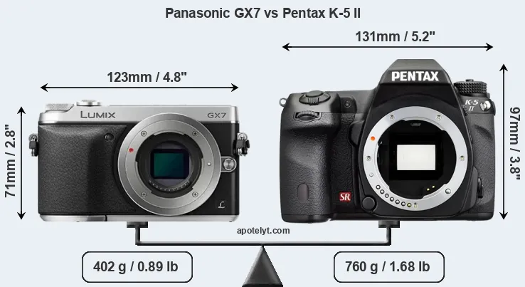 If the front view area (width x height) of the cameras is taken as an aggregate measure of their size, the Pentax K-5 II is considerably larger (46 percent) than the Panasonic GX7. Moreover, the K-5 II is substantially heavier (89 percent) than the GX7. It is noteworthy in this context that the K-5 II is splash and dust-proof, while the GX7 does not feature any corresponding weather-sealing.