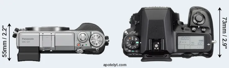 The physical size and weight of the Panasonic GX7 and the Pentax K-5 II are illustrated in the side-by-side display below. The two cameras are presented according to their relative size. Three consecutive views from the front, the top, and the rear side are shown. All width, height and depth measures are rounded to the nearest millimeter.