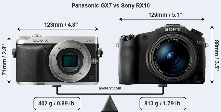 An illustration of the physical size and weight of the Panasonic GX7 and the Sony RX10 is provided in the side-by-side display below. The two cameras are presented according to their relative size. Three consecutive perspectives from the front, the top, and the back are available. All size dimensions are rounded to the nearest millimeter.