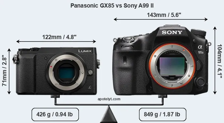 If the front view area (width x height) of the cameras is taken as an aggregate measure of their size, the Sony A99 II is considerably larger (72 percent) than the Panasonic GX85. Moreover, the A99 II is substantially heavier (99 percent) than the GX85. It is noteworthy in this context that the A99 II is splash and dust-proof, while the GX85 does not feature any corresponding weather-sealing.