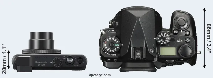 The side-by-side display below illustrates the physical size and weight of the Panasonic LF1 and the Pentax K-1 II. The two cameras are presented according to their relative size. Three consecutive perspectives from the front, the top, and the back are available. All size dimensions are rounded to the nearest millimeter.