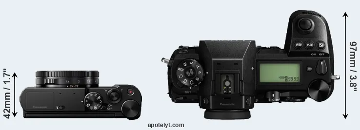 The side-by-side display below illustrates the physical size and weight of the Panasonic LX15 and the Panasonic S1. The two cameras are presented according to their relative size. Three consecutive views from the front, the top, and the rear side are shown. All width, height and depth dimensions are rounded to the nearest millimeter.