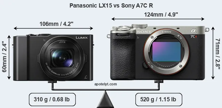 An illustration of the physical size and weight of the Panasonic LX15 and the Sony A7C R is provided in the side-by-side display below. The two cameras are presented according to their relative size. Three successive views from the front, the top, and the rear are shown. All width, height and depth dimensions are rounded to the nearest millimeter.