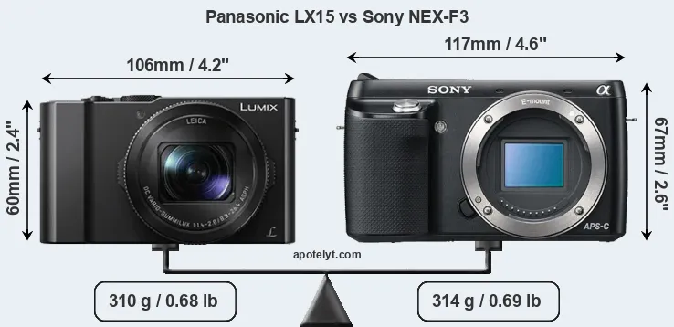 The above size and weight comparisons are to some extent incomplete and possibly misleading, as the LX15 has a lens built in, whereas the NEX-F3 is an interchangeable lens camera that requires a separate lens. Attaching the latter will add extra weight and bulk to the setup. You can compare the optics available for the NEX-F3 and their specifications in the Sony E-Mount Lens Catalog.