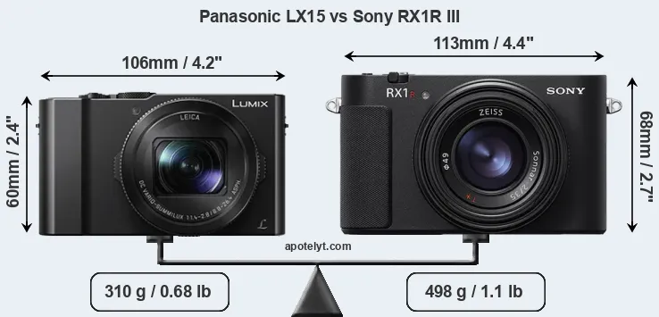 If the front view area (width x height) of the cameras is taken as an aggregate measure of their size, the Sony RX1R III is notably larger (21 percent) than the Panasonic LX15. Moreover, the RX1R III is substantially heavier (61 percent) than the LX15. It is noteworthy in this context that the RX1R III is splash and dust-proof, while the LX15 does not feature any corresponding weather-sealing.