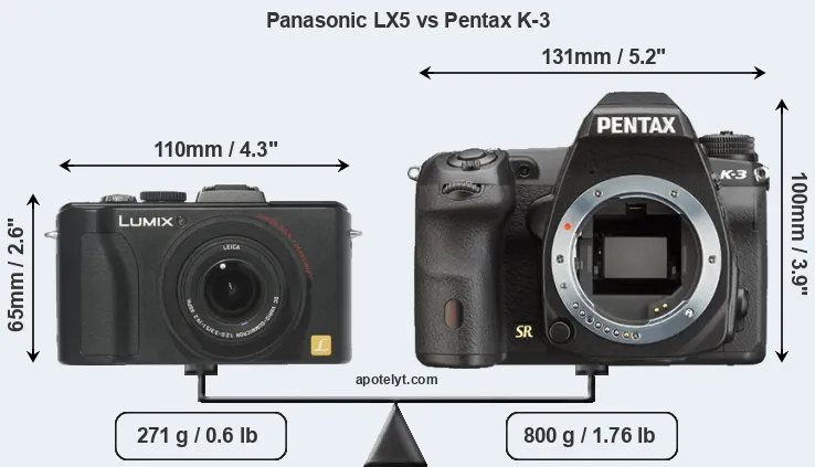 The above size and weight comparisons are to some extent incomplete and possibly misleading, as the LX5 has a lens built in, whereas the K-3 is an interchangeable lens camera that requires a separate lens. Attaching the latter will add extra weight and bulk to the setup.