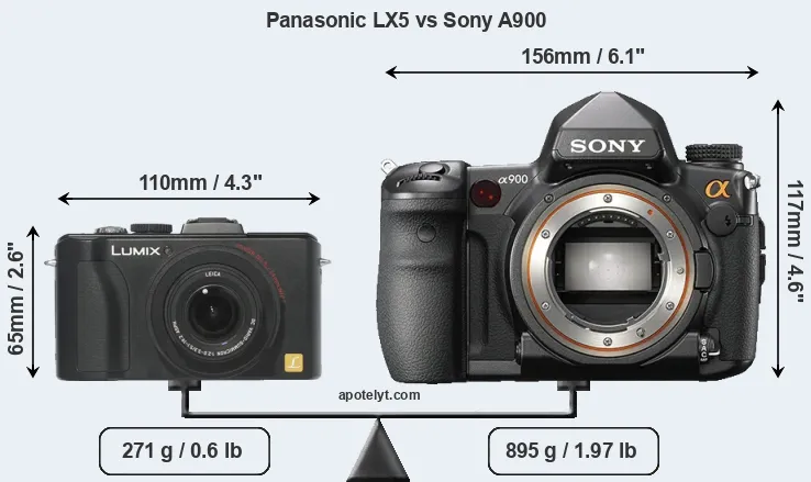 If the front view area (width x height) of the cameras is taken as an aggregate measure of their size, the Sony A900 is considerably larger (155 percent) than the Panasonic LX5. It is noteworthy in this context that the A900 is splash and dust-proof, while the LX5 does not feature any corresponding weather-sealing.