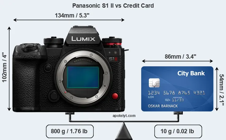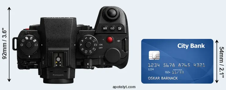The side-by-side display below illustrates the physical size of the Panasonic S1 II vis-à-vis a credit card. Three consecutive perspectives from the front, the top, and the back are presented. All size dimensions are rounded to the nearest millimeter.