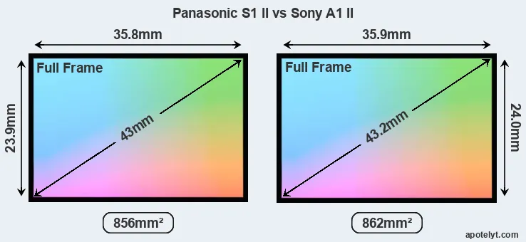 Both cameras under consideration feature a full frame sensor, but their sensors differ slightly in size. The sensor area in the A1 II is 1 percent bigger. They nevertheless have the same format factor of 1.0. Both cameras have a native aspect ratio (sensor width to sensor height) of 3:2.