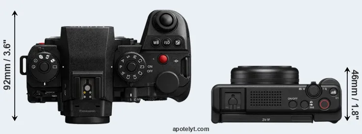 The physical size and weight of the Panasonic S1R II and the Sony ZV-1F are illustrated in the side-by-side display below. The two cameras are presented according to their relative size. Three consecutive perspectives from the front, the top, and the back are available. All size dimensions are rounded to the nearest millimeter.