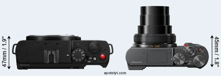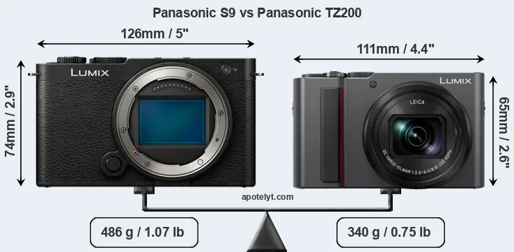 The physical size and weight of the Panasonic S9 and the Panasonic TZ200 are illustrated in the side-by-side display below. The two cameras are presented according to their relative size. Three consecutive perspectives from the front, the top, and the back are available. All width, height and depth dimensions are rounded to the nearest millimeter.