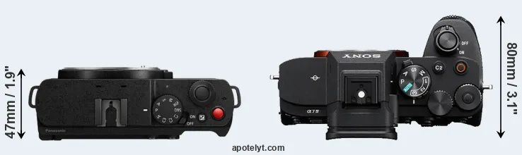 An illustration of the physical size and weight of the Panasonic S9 and the Sony A7 IV is provided in the side-by-side display below. The two cameras are presented according to their relative size. Three successive views from the front, the top, and the rear are shown. All size dimensions are rounded to the nearest millimeter.