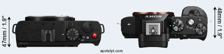 The side-by-side display below illustrates the physical size and weight of the Panasonic S9 and the Sony A7S. The two cameras are presented according to their relative size. Three successive views from the front, the top, and the rear are shown. All size dimensions are rounded to the nearest millimeter.