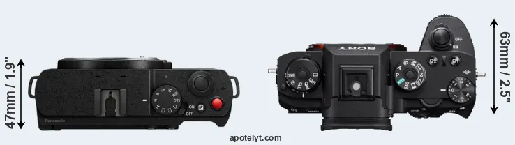 The physical size and weight of the Panasonic S9 and the Sony A9 are illustrated in the side-by-side display below. The two cameras are presented according to their relative size. Three consecutive views from the front, the top, and the rear side are shown. All width, height and depth dimensions are rounded to the nearest millimeter.