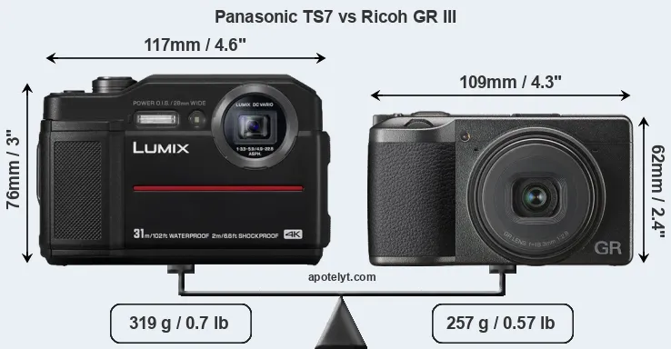 The physical size and weight of the Panasonic TS7 and the Ricoh GR III are illustrated in the side-by-side display below. The two cameras are presented according to their relative size. Three successive views from the front, the top, and the rear are shown. All width, height and depth measures are rounded to the nearest millimeter.