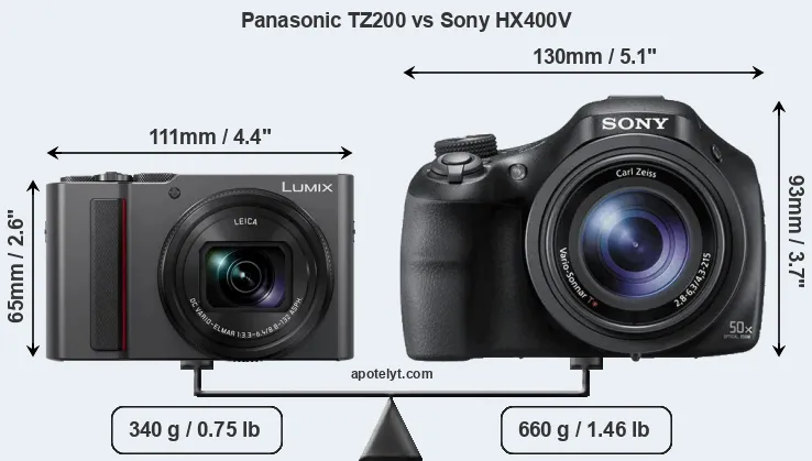 If the front view area (width x height) of the cameras is taken as an aggregate measure of their size, the Sony HX400V is considerably larger (68 percent) than the Panasonic TZ200. Moreover, the HX400V is substantially heavier (94 percent) than the TZ200. In this context, it is worth noting that neither the TZ200 nor the HX400V are weather-sealed.