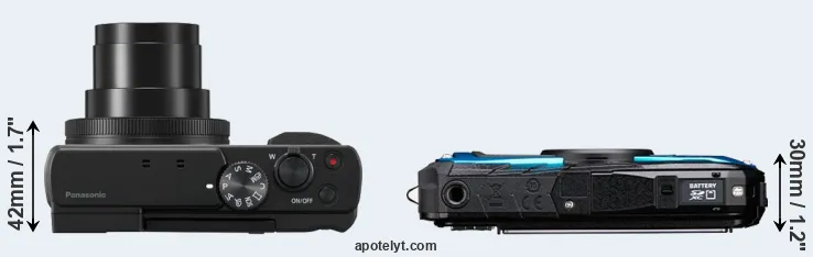 The side-by-side display below illustrates the physical size and weight of the Panasonic TZ95 and the Pentax WG-90. The two cameras are presented according to their relative size. Three consecutive views from the front, the top, and the rear side are shown. All width, height and depth measures are rounded to the nearest millimeter.