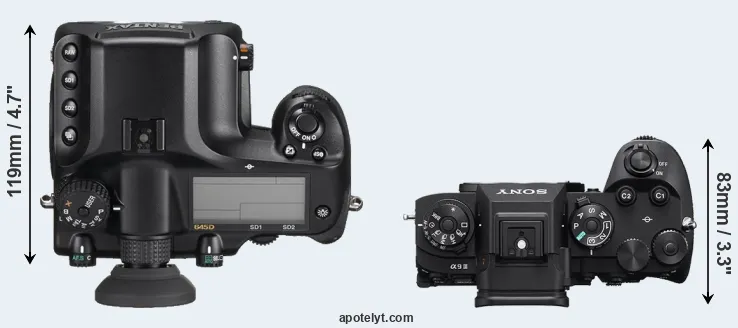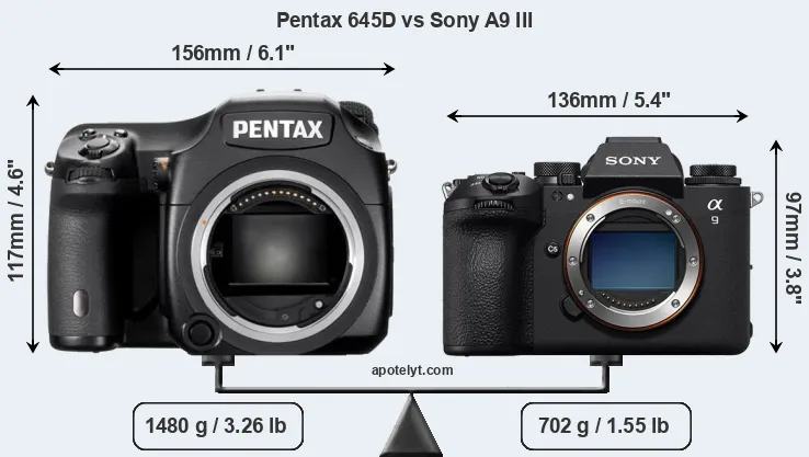 The side-by-side display below illustrates the physical size and weight of the Pentax 645D and the Sony A9 III. The two cameras are presented according to their relative size. Three consecutive views from the front, the top, and the rear side are shown. All size dimensions are rounded to the nearest millimeter.