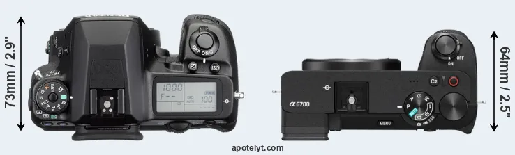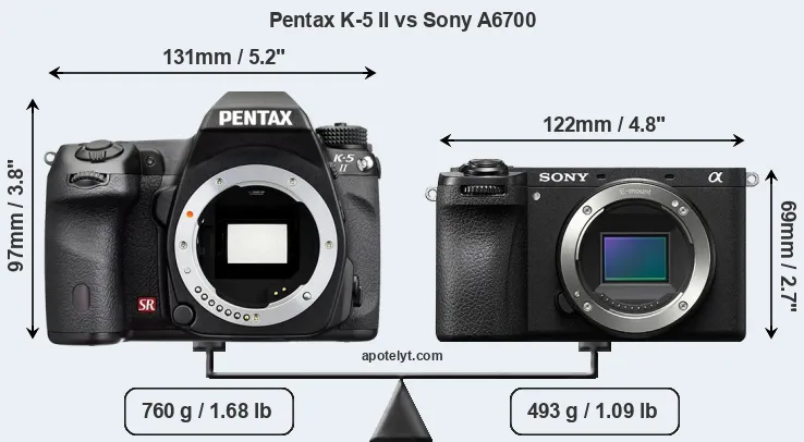 The physical size and weight of the Pentax K-5 II and the Sony A6700 are illustrated in the side-by-side display below. The two cameras are presented according to their relative size. Three consecutive perspectives from the front, the top, and the back are available. All width, height and depth dimensions are rounded to the nearest millimeter.