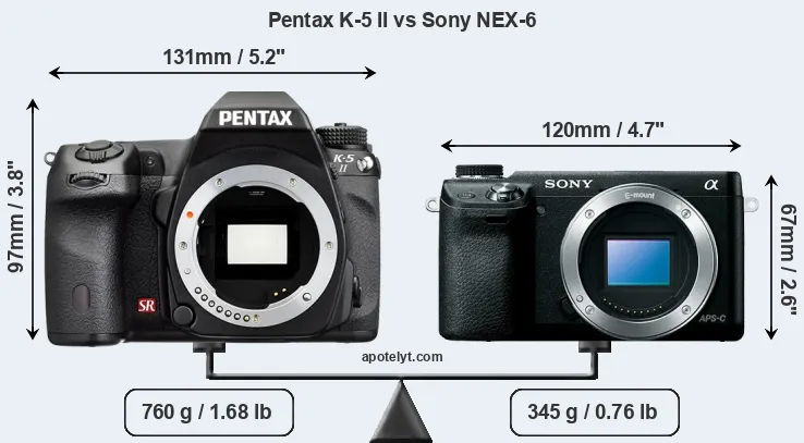 If the front view area (width x height) of the cameras is taken as an aggregate measure of their size, the Sony NEX-6 is considerably smaller (37 percent) than the Pentax K-5 II. Moreover, the NEX-6 is substantially lighter (55 percent) than the K-5 II. It is worth mentioning in this context that the K-5 II is splash and dust resistant, while the NEX-6 does not feature any corresponding weather-sealing.
