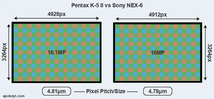 With 16.1MP, the K-5 II offers a slightly higher resolution than the NEX-6 (16MP), but the K-5 II nevertheless has marginally larger individual pixels (pixel pitch of 4.81μm versus 4.78μm for the NEX-6) due to its larger sensor. It is noteworthy in this context that the two cameras were released in close succession, so that their sensors are from the same technological generation.
