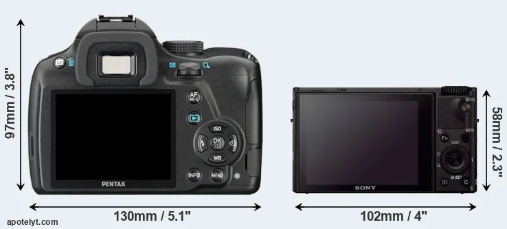 The physical size and weight of the Pentax K-50 and the Sony RX100 III are illustrated in the side-by-side display below. The two cameras are presented according to their relative size. Three successive views from the front, the top, and the rear are shown. All width, height and depth dimensions are rounded to the nearest millimeter.