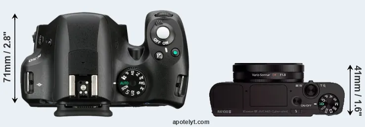 If the front view area (width x height) of the cameras is taken as an aggregate measure of their size, the Sony RX100 III is considerably smaller (53 percent) than the Pentax K-50. It is worth mentioning in this context that the K-50 is splash and dust resistant, while the RX100 III does not feature any corresponding weather-sealing.