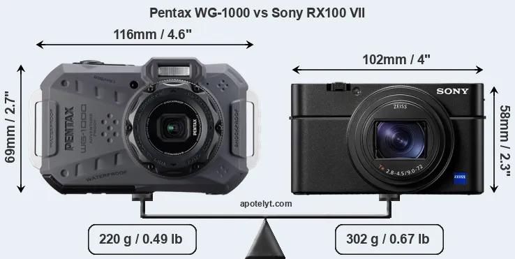 The physical size and weight of the Pentax WG-1000 and the Sony RX100 VII are illustrated in the side-by-side display below. The two cameras are presented according to their relative size. Three consecutive views from the front, the top, and the rear side are shown. All size dimensions are rounded to the nearest millimeter.