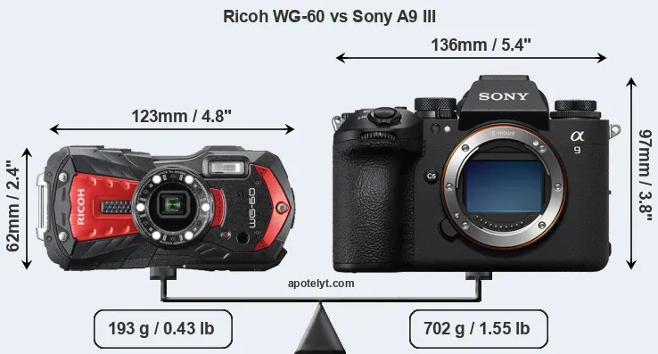The physical size and weight of the Ricoh WG-60 and the Sony A9 III are illustrated in the side-by-side display below. The two cameras are presented according to their relative size. Three consecutive perspectives from the front, the top, and the back are available. All width, height and depth dimensions are rounded to the nearest millimeter.