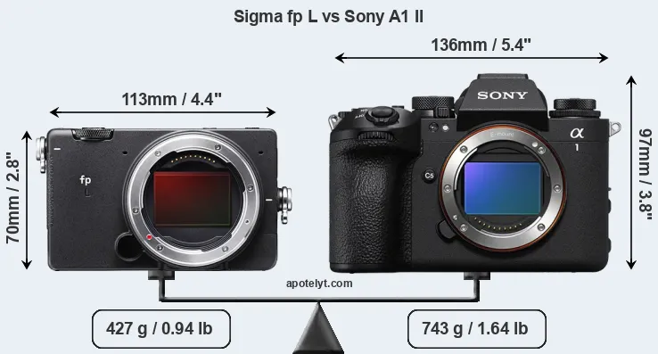 The side-by-side display below illustrates the physical size and weight of the Sigma fp L and the Sony A1 II. The two cameras are presented according to their relative size. Three consecutive perspectives from the front, the top, and the back are available. All width, height and depth measures are rounded to the nearest millimeter.