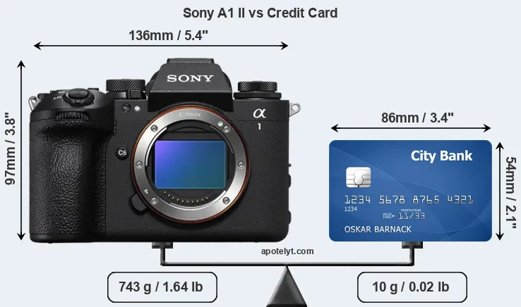 The side-by-side display below illustrates the physical size of the Sony A1 II vis-à-vis a credit card. Three successive views from the front, the top, and the rear are shown. All width, height and depth measures are rounded to the nearest millimeter.