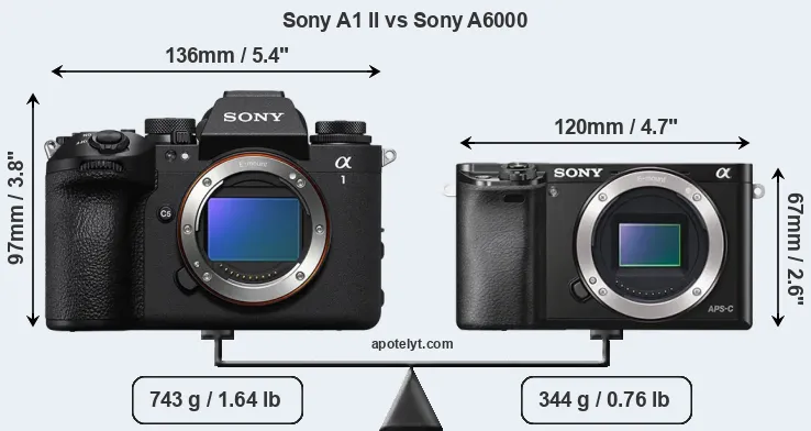 If the front view area (width x height) of the cameras is taken as an aggregate measure of their size, the Sony A6000 is considerably smaller (39 percent) than the Sony A1 II. Moreover, the A6000 is substantially lighter (54 percent) than the A1 II. It is worth mentioning in this context that the A1 II is splash and dust resistant, while the A6000 does not feature any corresponding weather-sealing.