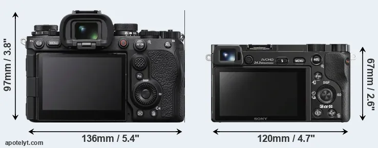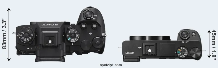 The side-by-side display below illustrates the physical size and weight of the Sony A1 II and the Sony A6000. The two cameras are presented according to their relative size. Three consecutive perspectives from the front, the top, and the back are available. All width, height and depth dimensions are rounded to the nearest millimeter.