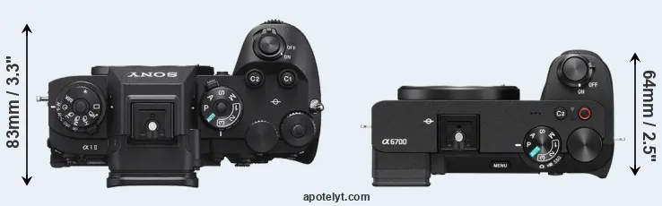 The side-by-side display below illustrates the physical size and weight of the Sony A1 II and the Sony A6700. The two cameras are presented according to their relative size. Three consecutive perspectives from the front, the top, and the back are available. All width, height and depth measures are rounded to the nearest millimeter.