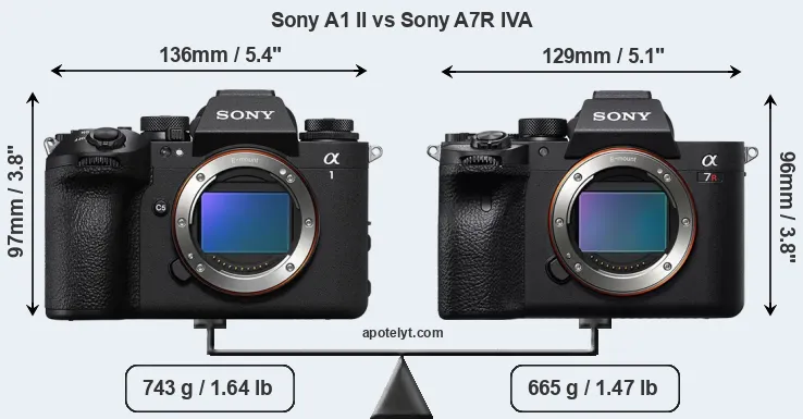 An illustration of the physical size and weight of the Sony A1 II and the Sony A7R IVA is provided in the side-by-side display below. The two cameras are presented according to their relative size. Three successive views from the front, the top, and the rear are shown. All width, height and depth dimensions are rounded to the nearest millimeter.
