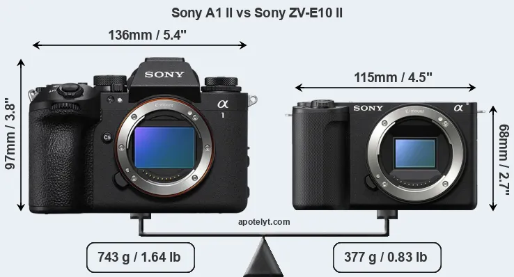 An illustration of the physical size and weight of the Sony A1 II and the Sony ZV-E10 II is provided in the side-by-side display below. The two cameras are presented according to their relative size. Three consecutive perspectives from the front, the top, and the back are available. All width, height and depth dimensions are rounded to the nearest millimeter.