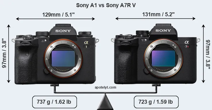 The physical size and weight of the Sony A1 and the Sony A7R V are illustrated in the side-by-side display below. The two cameras are presented according to their relative size. Three consecutive views from the front, the top, and the rear side are shown. All width, height and depth dimensions are rounded to the nearest millimeter.