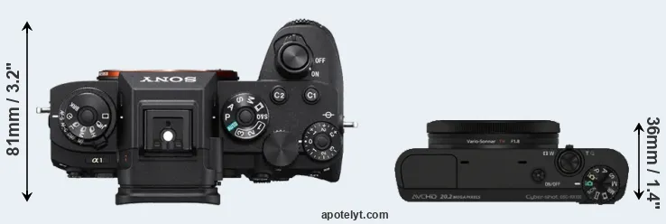 An illustration of the physical size and weight of the Sony A1 and the Sony RX100 is provided in the side-by-side display below. The two cameras are presented according to their relative size. Three consecutive perspectives from the front, the top, and the back are available. All width, height and depth measures are rounded to the nearest millimeter.