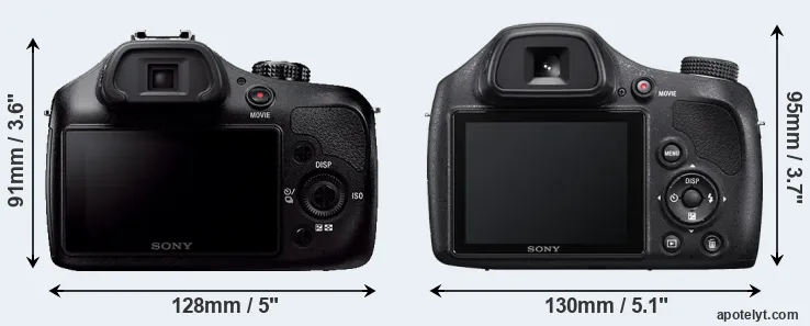 An illustration of the physical size and weight of the Sony A3000 and the Sony H400 is provided in the side-by-side display below. The two cameras are presented according to their relative size. Three consecutive perspectives from the front, the top, and the back are available. All width, height and depth dimensions are rounded to the nearest millimeter.