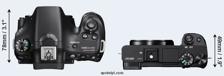 The physical size and weight of the Sony A58 and the Sony A6300 are illustrated in the side-by-side display below. The two cameras are presented according to their relative size. Three consecutive perspectives from the front, the top, and the back are available. All width, height and depth dimensions are rounded to the nearest millimeter.