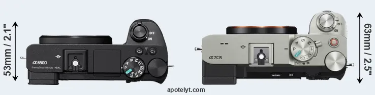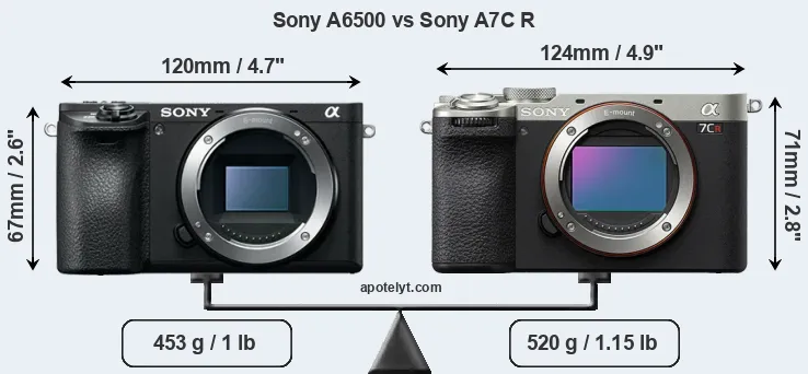 An illustration of the physical size and weight of the Sony A6500 and the Sony A7C R is provided in the side-by-side display below. The two cameras are presented according to their relative size. Three successive views from the front, the top, and the rear are shown. All width, height and depth dimensions are rounded to the nearest millimeter.
