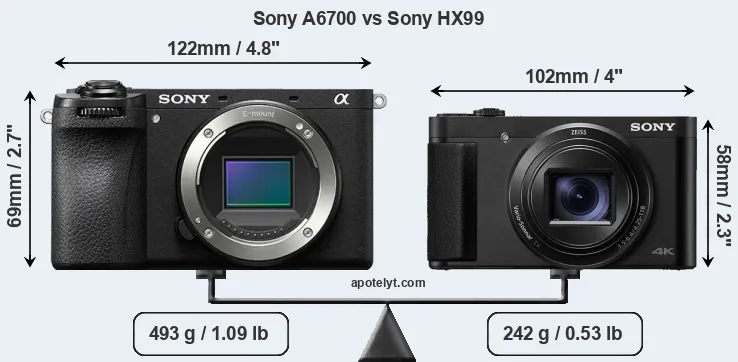 The side-by-side display below illustrates the physical size and weight of the Sony A6700 and the Sony HX99. The two cameras are presented according to their relative size. Three consecutive perspectives from the front, the top, and the back are available. All width, height and depth measures are rounded to the nearest millimeter.