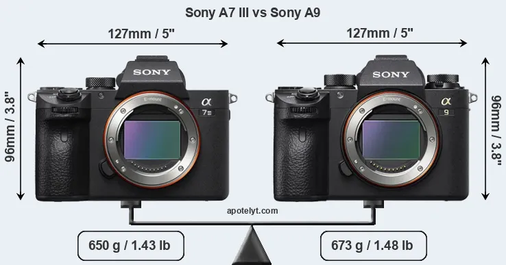 The physical size and weight of the Sony A7 III and the Sony A9 are illustrated in the side-by-side display below. The two cameras are presented according to their relative size. Three consecutive perspectives from the front, the top, and the back are available. All width, height and depth dimensions are rounded to the nearest millimeter.