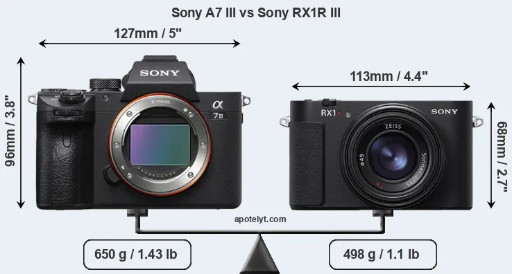 The side-by-side display below illustrates the physical size and weight of the Sony A7 III and the Sony RX1R III. The two cameras are presented according to their relative size. Three consecutive perspectives from the front, the top, and the back are available. All size dimensions are rounded to the nearest millimeter.