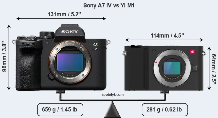 If the front view area (width x height) of the cameras is taken as an aggregate measure of their size, the YI M1 is considerably smaller (42 percent) than the Sony A7 IV. Moreover, the M1 is substantially lighter (57 percent) than the A7 IV. It is worth mentioning in this context that the A7 IV is splash and dust resistant, while the M1 does not feature any corresponding weather-sealing.