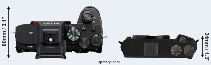 The physical size and weight of the Sony A7 IV and the YI M1 are illustrated in the side-by-side display below. The two cameras are presented according to their relative size. Three consecutive views from the front, the top, and the rear side are shown. All size dimensions are rounded to the nearest millimeter.
