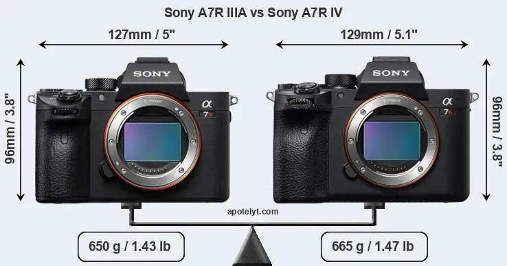 An illustration of the physical size and weight of the Sony A7R IIIA and the Sony A7R IV is provided in the side-by-side display below. The two cameras are presented according to their relative size. Three consecutive views from the front, the top, and the rear side are shown. All width, height and depth measures are rounded to the nearest millimeter.