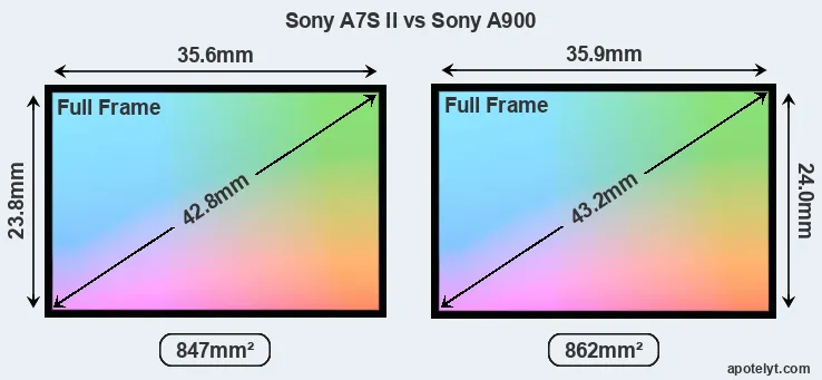 With 24.4MP, the A900 offers a higher resolution than the A7S II (12MP), but the A900 has smaller individual pixels (pixel pitch of 5.94μm versus 8.40μm for the A7S II). Yet, the A7S II is a much more recent model (by 7 years) than the A900, and its sensor will have benefitted from technological advances during this time that further enhance the light gathering capacity of its pixel-units.