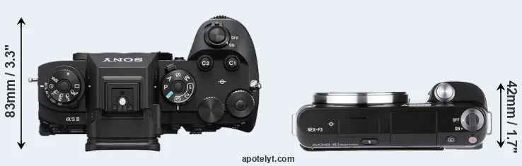 The side-by-side display below illustrates the physical size and weight of the Sony A9 III and the Sony NEX-F3. The two cameras are presented according to their relative size. Three consecutive views from the front, the top, and the rear side are shown. All size dimensions are rounded to the nearest millimeter.