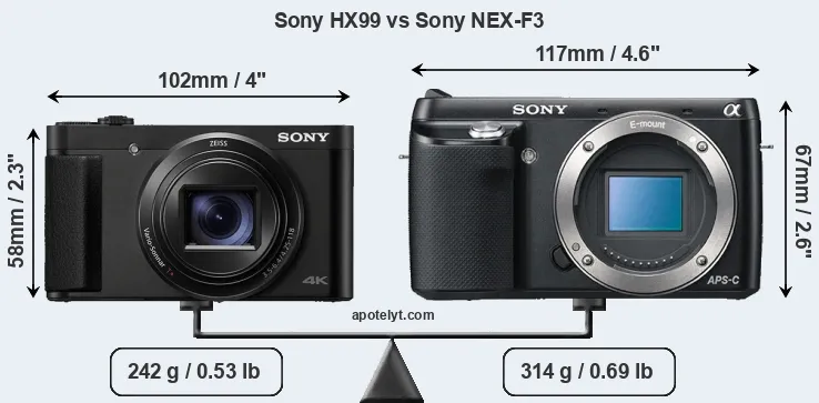 An illustration of the physical size and weight of the Sony HX99 and the Sony NEX-F3 is provided in the side-by-side display below. The two cameras are presented according to their relative size. Three consecutive perspectives from the front, the top, and the back are available. All width, height and depth dimensions are rounded to the nearest millimeter.
